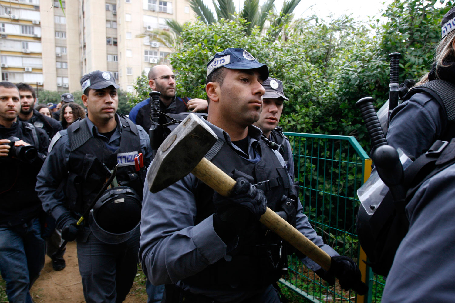 ضباط من القوات الخاصة يقتحمون مجمع سكان في كفار شاليم في كانون أول  2007، لإجلاء السكان من الحي الذي يقطنونه منذ عام 1949،وجرى الاخلاء بعد أن قام مقاول بشراء الارض في الحي لبناء شقق فخمة.